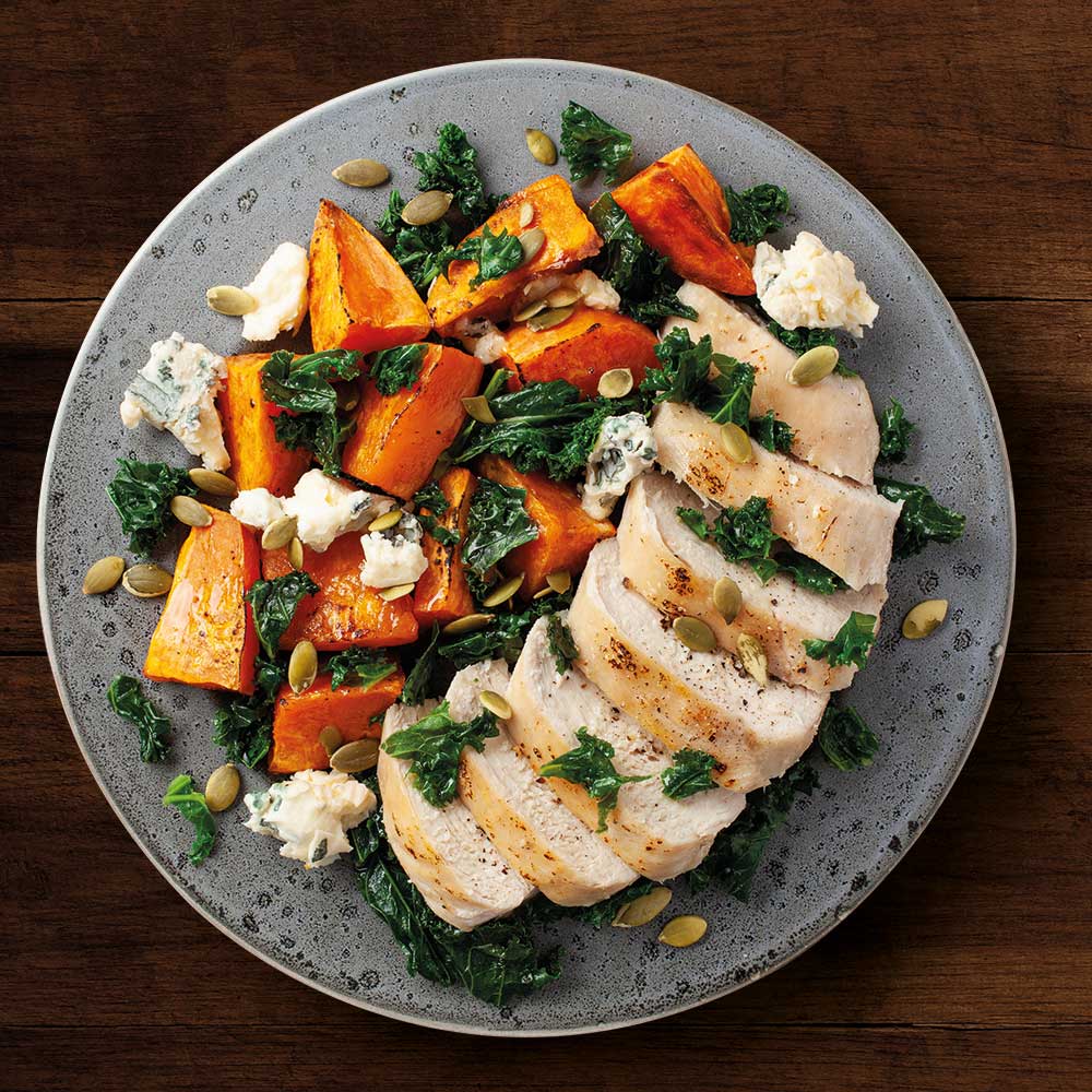 Hähnchen mit Grünkohl, Süßkartoffeln und Blauschimmelkäse