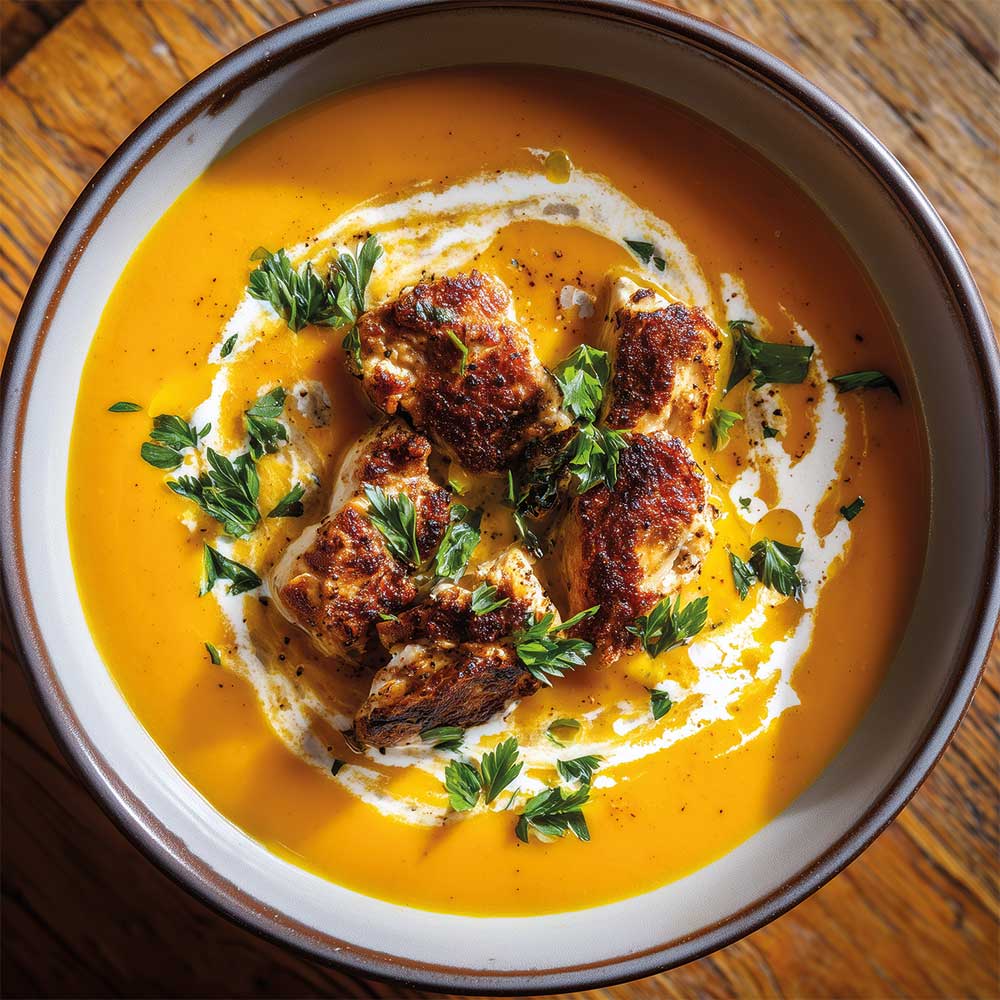 Möhrensuppe mit gebratenem Hähnchen