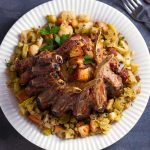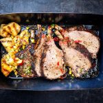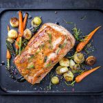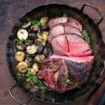 Das Fleisch aus dem Ofen nehmen und in dicke Scheiben schneiden. Die gebratenen Zwiebeln darüber geben. Zusammen mit den Bratkartoffeln und der Soße anrichten.