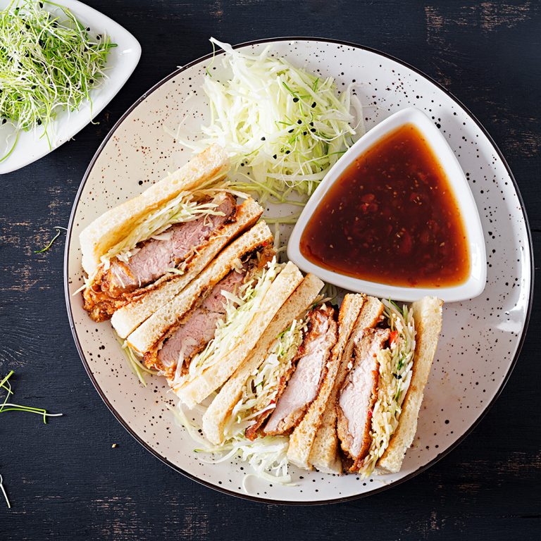 Das beliebte japanische Sandwich wird mit einem panierten Schweineschnitzel belegt und ist die ideale Mahlzeit zum Mitnehmen.