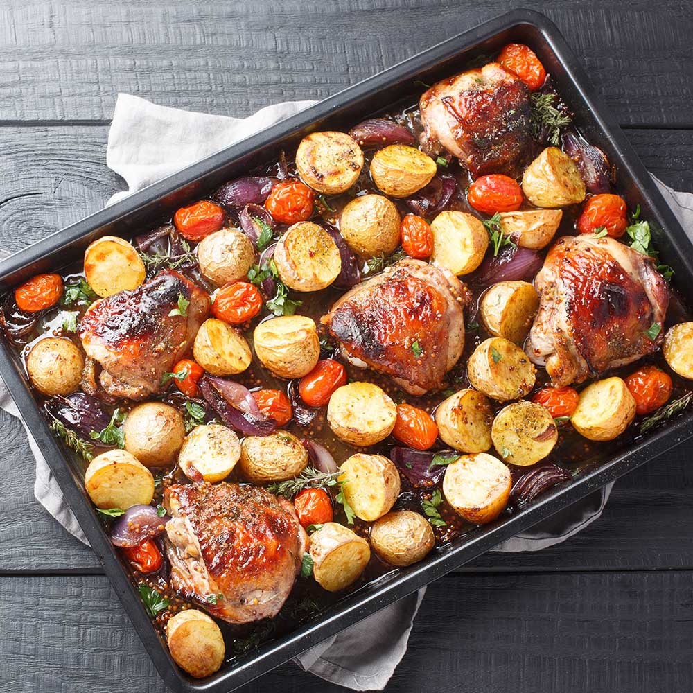 Hähnchenbrustfilets mit der Hautseite nach oben auf das Blech legen. Gemüse drumherum verteilen. Für 35–40 Minuten backen. Nach etwa 25 Minuten das Gemüse einmal wenden, damit es gleichmäßig bräunt.