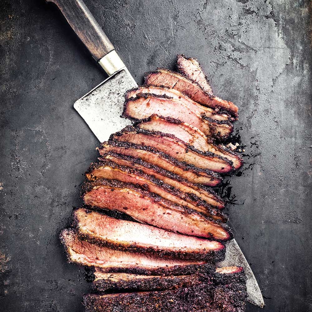 Rinderbrust abtupfen. Überschüssiges Fett abschneiden und etwaige Sehnen entfernen oder beim Einkauf den Fleischer bitten, das Beef Briskett zu parieren.