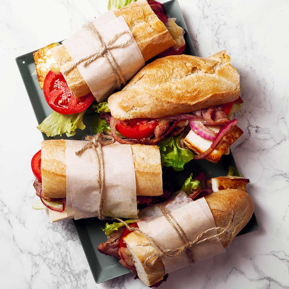Untere Brothälfte mit Salat, Halloumi und Bacon belegen. Tomaten in Scheiben schneiden und ebenfalls auf das Brot legen, obenauf die karamellisierten Zwiebeln. Brotdeckel drauf, in Stücke schneiden – fertig! Wickel das Baguette für unterwegs in Butterbrotpapier oder Bienenwachstuch – hält es zusammen und sieht schick aus fürs Picknick.