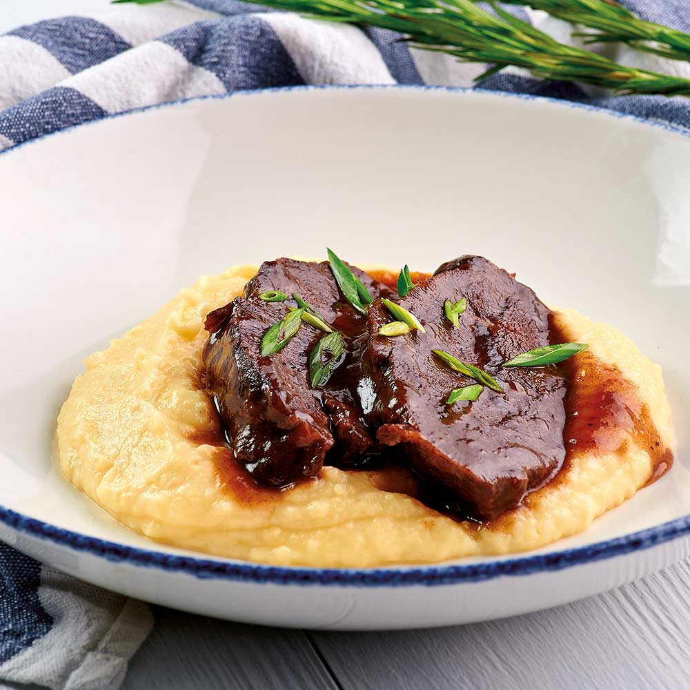 Für das Kartoffelpüree Knoblauch schälen und fein hacken. Pinienkerne hacken. Kartoffeln mit Schale in einem Topf mit Salzwasser kochen, bis sie weich sind. Abgießen und ausdampfen lassen. Kartoffeln pellen und fein zerstampfen. Knoblauch, Pinienkerne, Olivenöl dazugeben. Mit Salz, Pfeffer und Muskatnuss abschmecken. Kartoffelpüree mit den Schweinebäckchen anrichten und genießen.