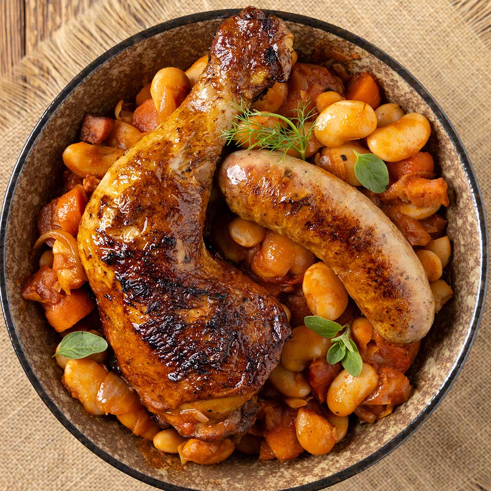 Bohnen, Gemüse, Speck, Hähnchenkeulen und Würste in den Schmortopf geben. Mit Fond aufgießen, bis alles knapp bedeckt ist. Bouquet garni einlegen, mit Salz und Pfeffer würzen. Im vorgeheizten Ofen bei 150 °C etwa 2 Stunden schmoren lassen. Ab und zu prüfen, ob noch genug Flüssigkeit vorhanden ist, ggf. etwas Fond oder Wasser nachgießen. Dazu passt knuspriges Landbrot und ein kräftiger Rotwein.