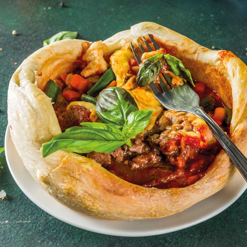 Fülle das vorbereitete Ragout in eine ofenfeste Schüssel und bestreue die Masse gleichmäßig mit dem geriebenen Käse. Rolle den Pizzateig aus und schneide einen Kreis aus, der größer ist als die Schüssel, damit er als Deckel fungieren kann.
