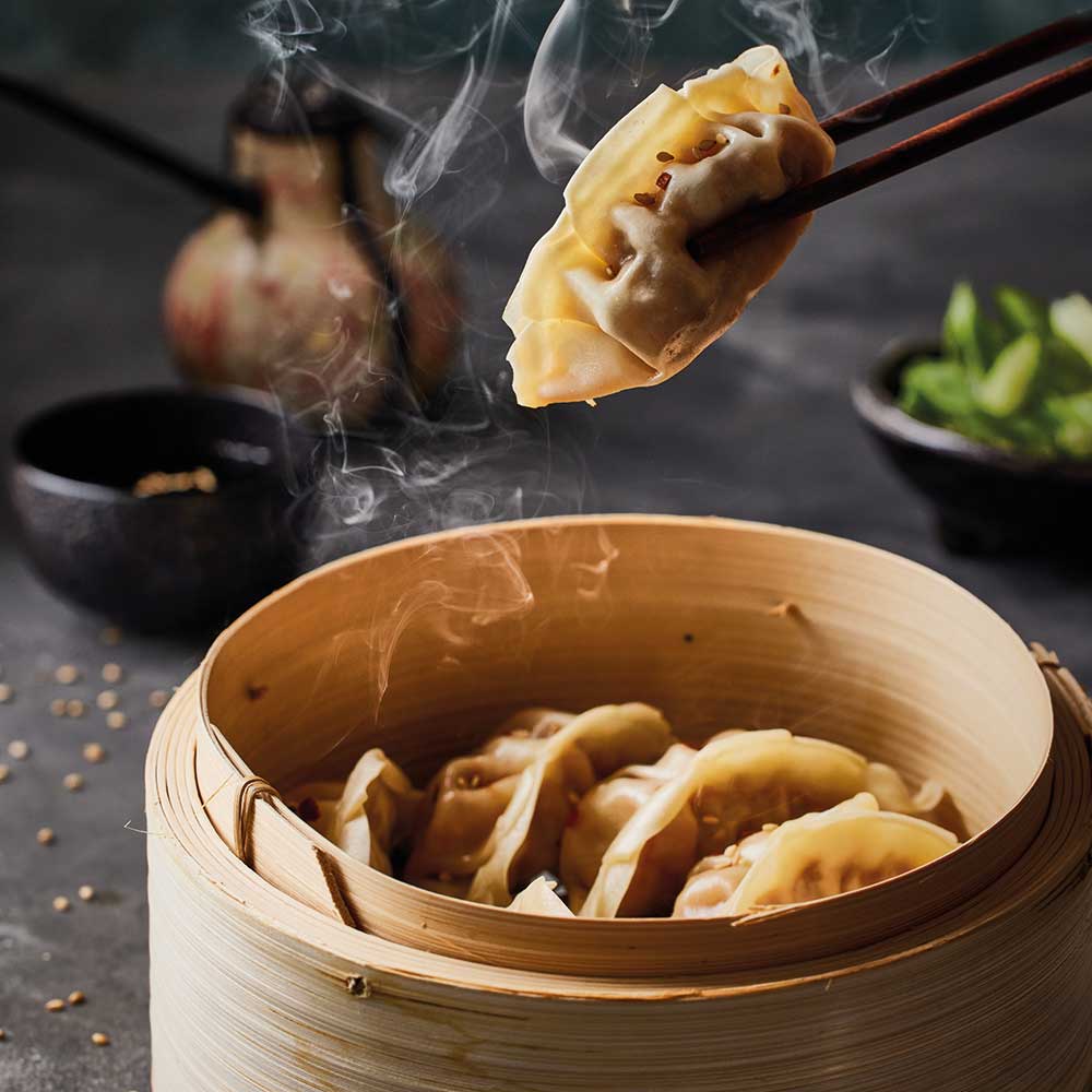 Für die Füllung Chinakohl fein hacken, in eine Schüssel geben und mit etwas Salz bestreuen. 10 Minuten stehen lassen, dann das überschüssige Wasser ausdrücken. Schweinehackfleisch zugeben. Frühlingszwiebeln hacken. Knoblauch und Ingwer schälen und ebenfalls fein hacken. Alles zum Kohl und Fleisch in die Schüssel geben. Sojasoße, Sesamöl, Reiswein, Zucker, Salz und Pfeffer zugeben und gut vermischen.