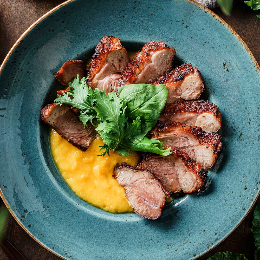 Haut der Entenbrust rautenförmig einschneiden (nicht ins Fleisch schneiden). Mit Salz, Pfeffer und etwas Gewürzmischung würzen. Entenbrust mit der Hautseite nach unten in eine kalte, beschichtete Pfanne legen und ohne Fett bei mittlerer Hitze langsam auslassen (ca. 6–8 Minuten), bis die Haut goldbraun und knusprig ist.