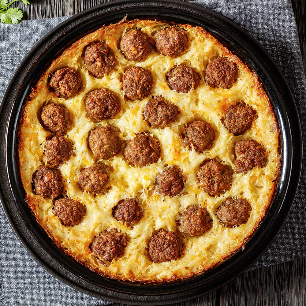 In einer Pfanne Butter schmelzen und darin Zwiebel- und Knoblauchwürfel anschwitzen. Kartoffeln hinzufügen. In einer Schale Crème fraîche, Senf und Käse verrühren, Salz, Pfeffer und Muskat abschmecken und mit der Kartoffel-Zwiebel-Mischung vermengen. Masse in die Form füllen. Hackbällchen darauf verteilen, leicht eindrücken und anschließend im Ofen für ca. 45 Minuten backen.
