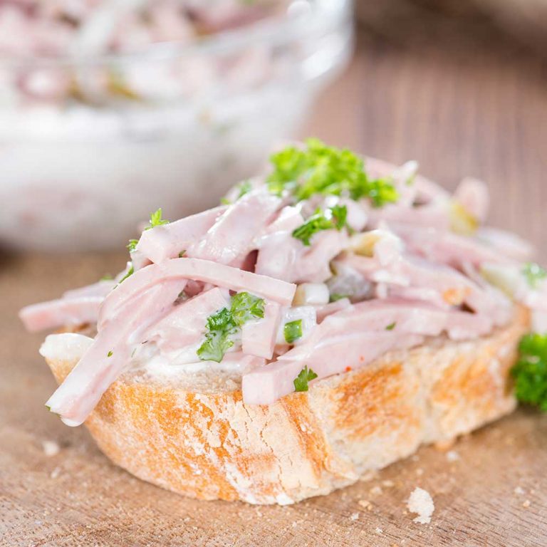 Fleischwurst in feine Streifen schneiden. Gewürzgurken in kleine Würfel oder feine Streifen schneiden. Zwiebel sehr fein würfeln.
