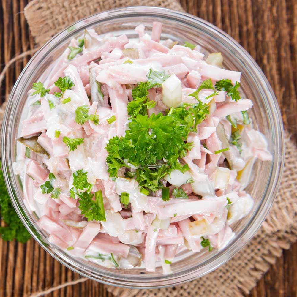 Fleischwurst- und Gurkenstreifen in die Schüssel mit dem Dressing geben. Alles gründlich miteinander vermengen, sodass die Zutaten gut mit dem Dressing bedeckt sind. Den Fleischsalat noch einmal abschmecken und bei Bedarf nachwürzen. Für ein bisschen Frische können gehackte Kräuter wie Schnittlauch oder Petersilie untergehoben werden. Den Fleischsalat mindestens 30 Minuten im Kühlschrank ziehen lassen, damit die Aromen sich entfalten können.