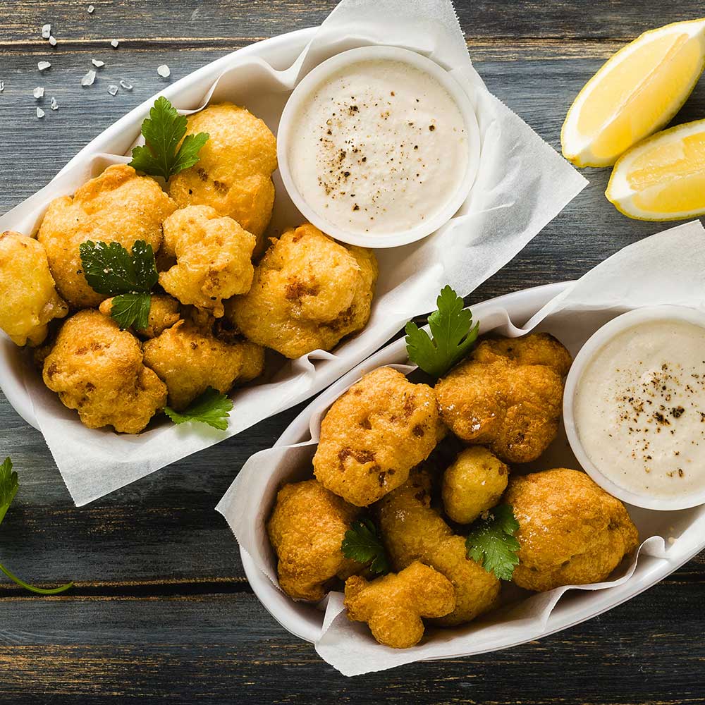 Öl in einem tiefen Topf oder einer Fritteuse auf ca. 170–180 °C erhitzen. Blumenkohlröschen nacheinander in den Teig tauchen, leicht abtropfen lassen und vorsichtig ins heiße Öl geben. In kleinen Portionen 3–4 Minuten frittieren, bis sie goldbraun und knusprig sind. Mit einer Schaumkelle herausnehmen und auf Küchenpapier abtropfen lassen.