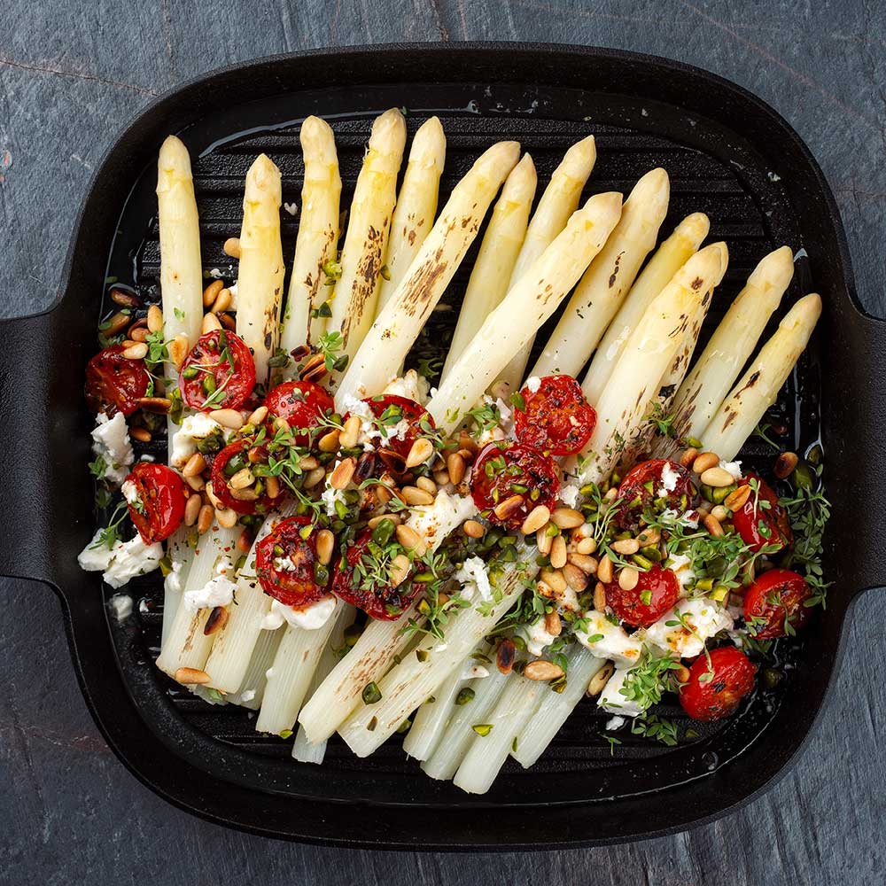 Gebackener Spargel mit Tomaten-Feta-Pinienkerne-Topping