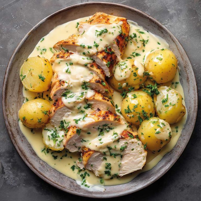 Gebratenes Hähnchen mit Kartoffeln und Käsesoße