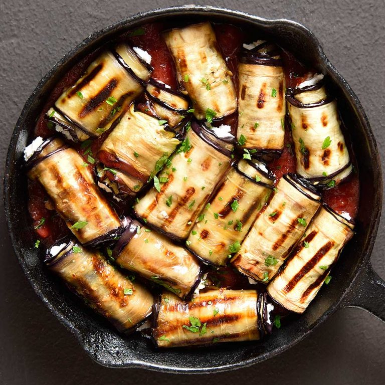 Auberginen der Länge nach in ca. 0,5 cm dünne Scheiben schneiden. Mit Salz bestreuen, ca. 10 Minuten ziehen lassen, danach abtupfen und auf dem Grill oder in einer Grillpfanne von beiden Seiten braten, bis sie leicht gebräunt sind.