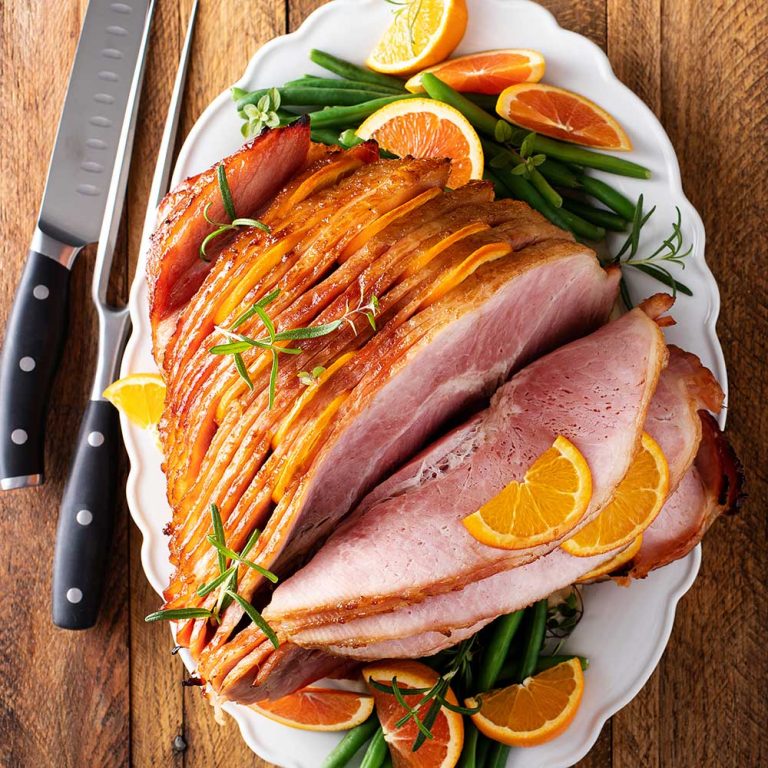 Für die Glasur Abrieb und Saft einer Orange mit Honig, Zucker, Senf, Orangensaft, Rosmarin und Essig verrühren. Schinken rundum mit der Glasur bepinseln. 60–90 Minuten im Ofen backen, währenddessen alle 20 Minuten mit Glasur und Bratensaft übergießen. Wird die Oberfläche zu dunkel, locker mit Alufolie abdecken. Am Ende mit der restlichen Glasur bepinseln und 5 Minuten unter dem Grill karamellisieren.