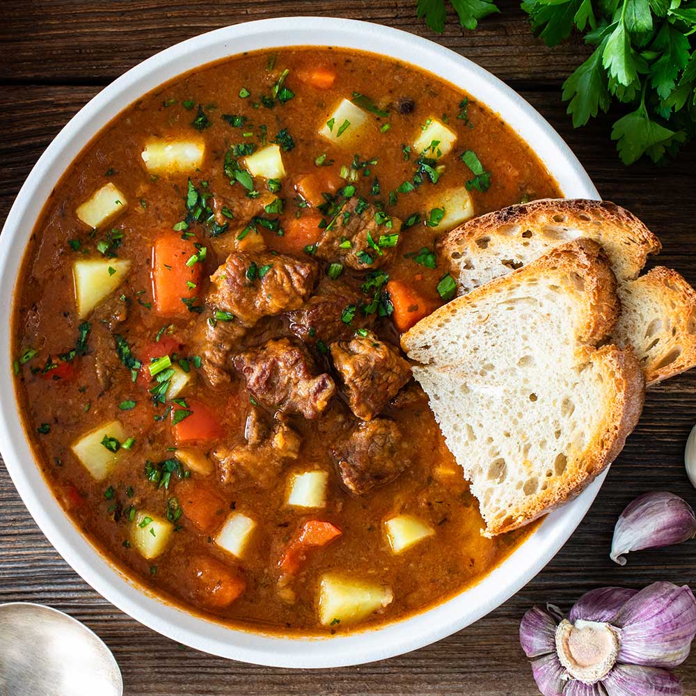 Mit Paprikapulver, Majoran und Mehl bestäuben, umrühren. Mit Rotwein und Brühe ablöschen. Fleisch wieder zugeben, Lorbeerblatt hinzufügen und zugedeckt bei kleiner Hitze 60–75 Minuten köcheln, bis das Fleisch weich ist.