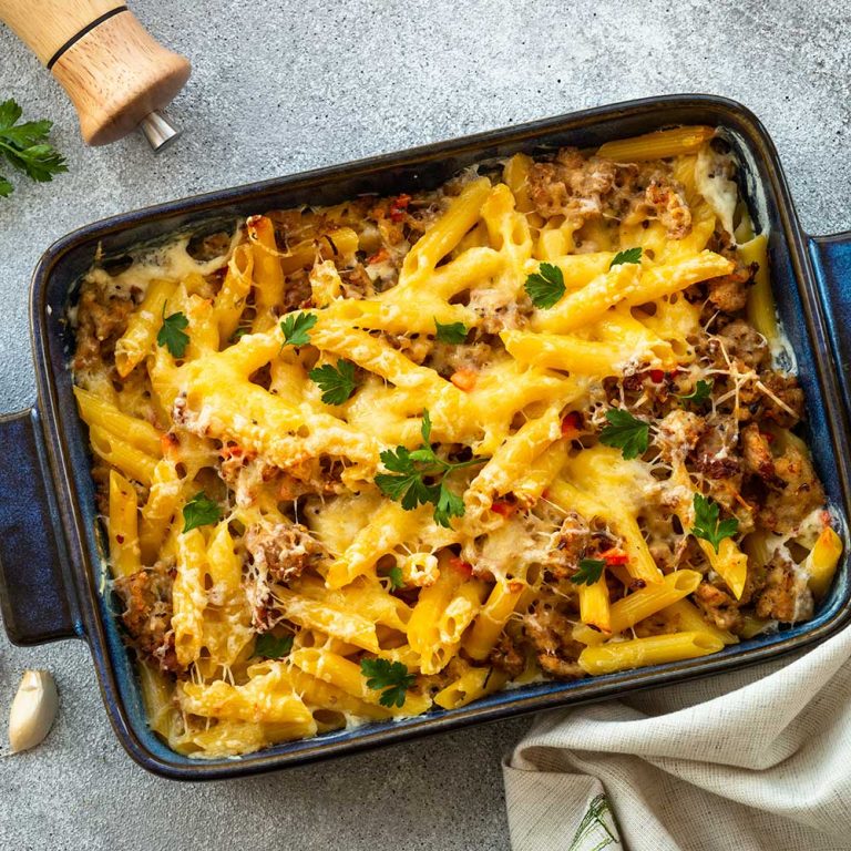 In einem großen Topf mit Salzwasser Pasta nach Packungsangaben garen. Ofen auf 180 °C Umluft vorheizen.