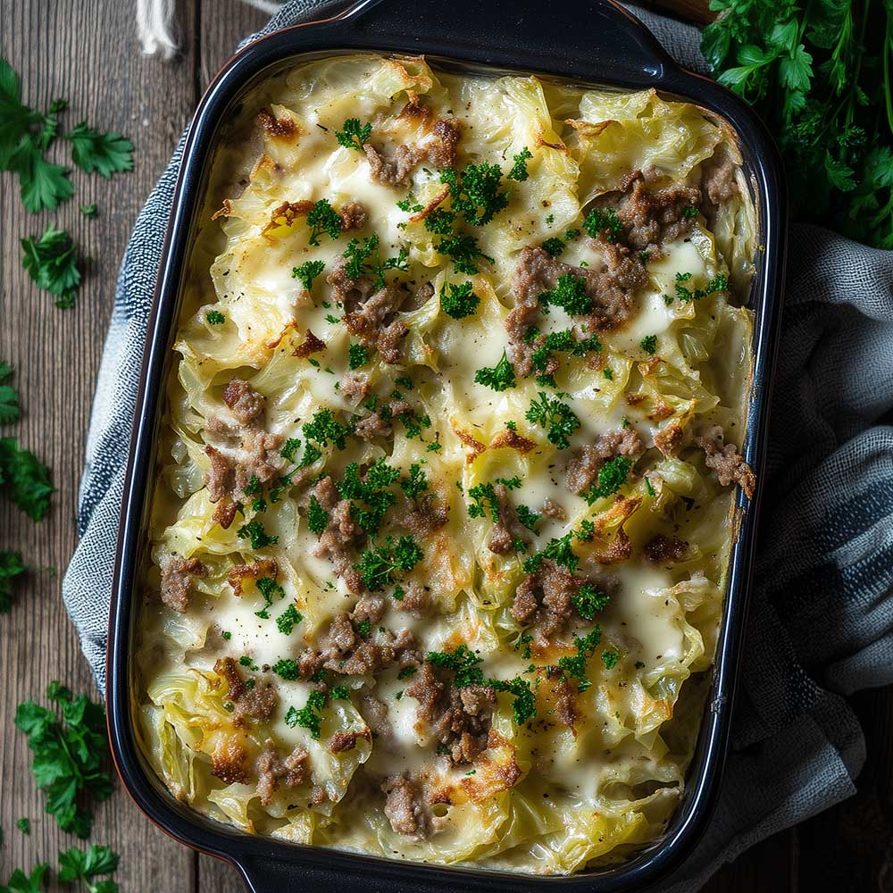 Geriebenen Käse gleichmäßig über den Auflauf streuen. Im vorgeheizten Backofen bei 180 °C Ober-/Unterhitze ca. 25–30 Minuten backen, bis der Käse goldbraun ist. Anschließend mit gehackter Petersilie bestreuen. Dazu passt ein frisches Baguette oder Kartoffelpüree.