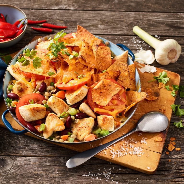Hähnchenfleisch, Linsen und Bohnen untermischen. Aufkochen, in eine große Auflaufform geben. Tomaten und Lauchzwiebeln waschen, putzen, in dünne Scheiben schneiden. Chili mit Tomatenscheiben belegen, Nachos locker darauf verteilen. Alles mit Käse bestreuen. Im Ofen 6–8 Minuten überbacken.