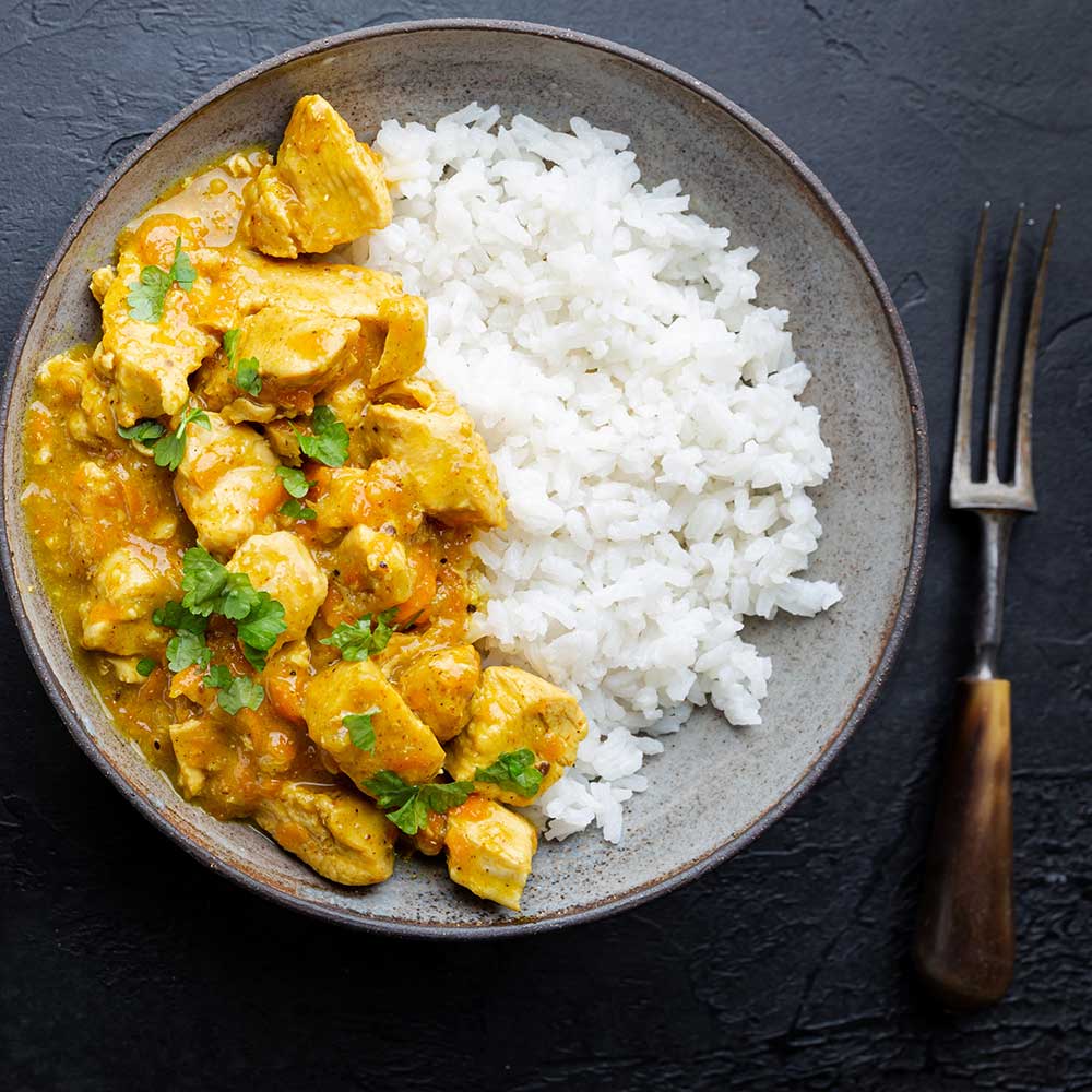 Curry-, Paprikapulver und Kurkuma zugeben, kurz mitrösten. Tomatenmark einrühren. Kokosmilch und Gemüsebrühe angießen. Hähnchenfleisch zurück in die Pfanne geben. 10 Minuten leicht köcheln.