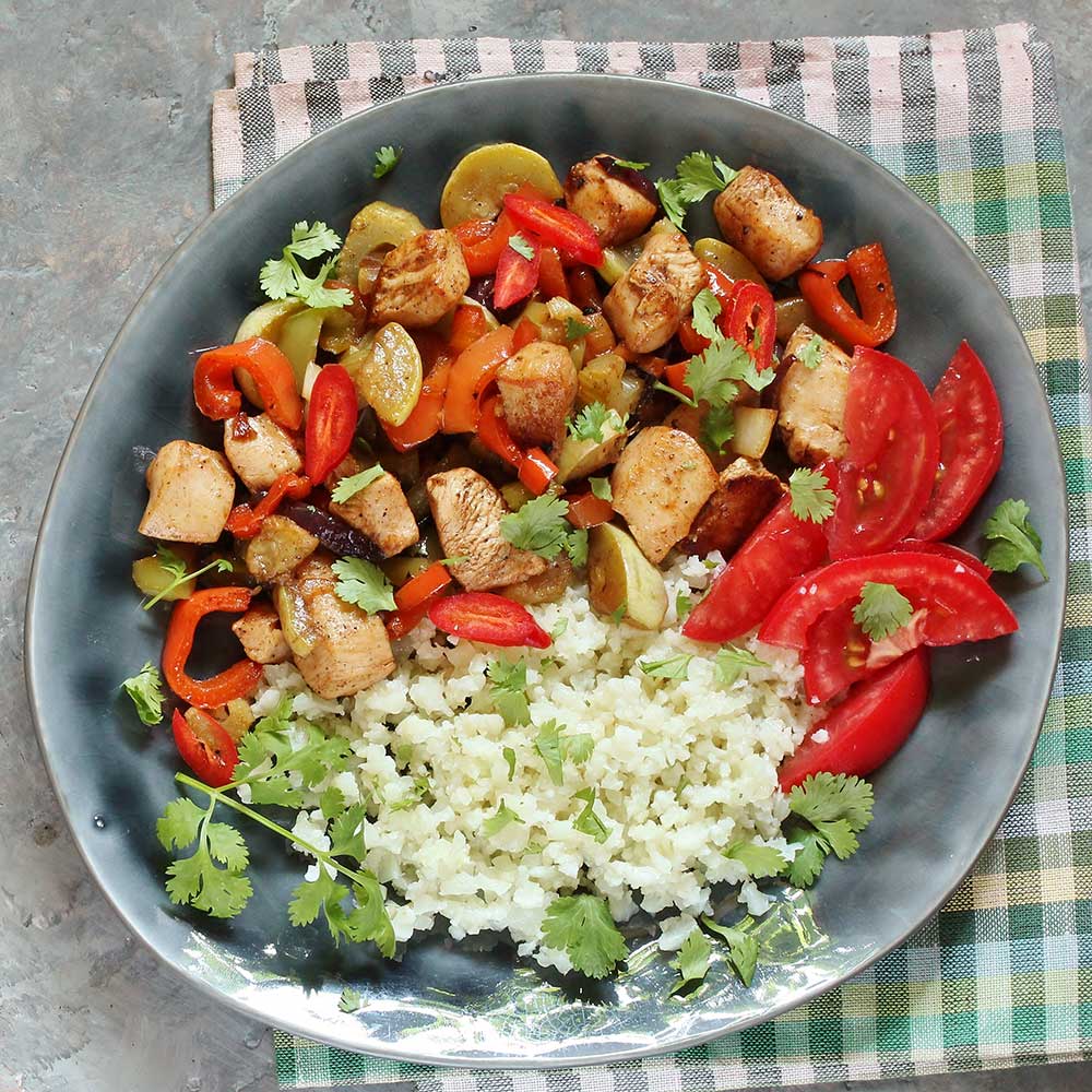 Eine leckere Pfanne mit Hähnchenbrustfilet und Blumenkohl-Reis