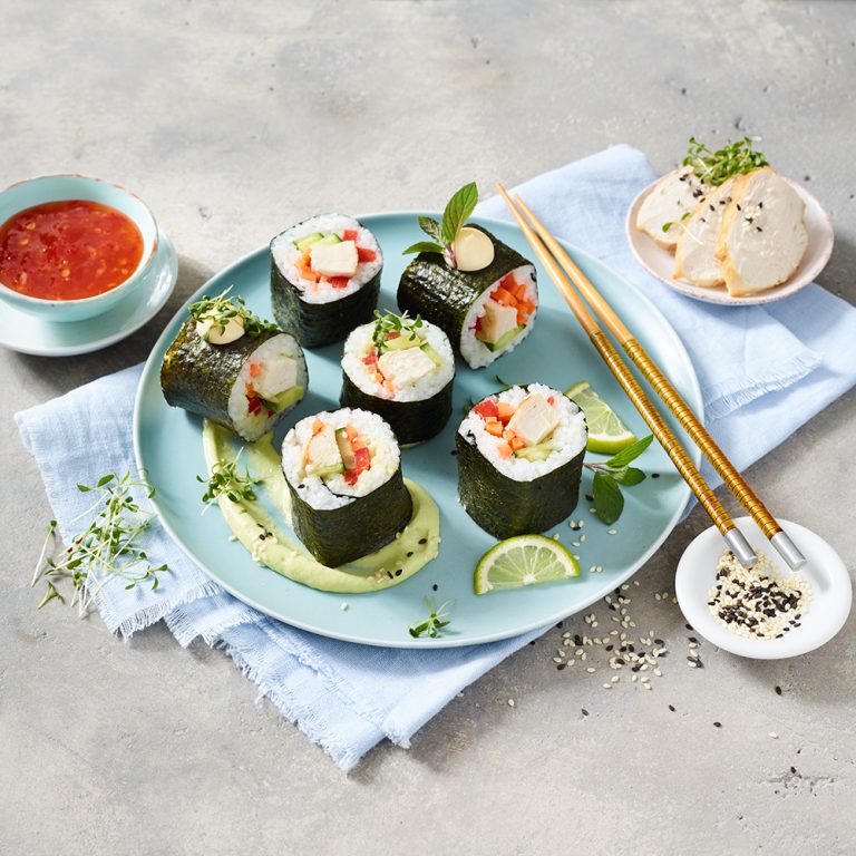 Möhre schälen, in feine Streifen schneiden. Paprika putzen, entkernen, waschen und in Streifen schneiden. Gurke putzen, vierteln, in Streifen schneiden. Noriblätter halbieren. Eine Hälfte auf die Sushimatte legen, mit einer 1 cm dicken Schicht Sushireis bedecken. Am unteren Rand eine kleine Rille eindrücken. Zwei Stücke Hähnchenfleisch in die Rille legen. Mit Avocadocreme bestreichen, Gemüse davor verteilen.