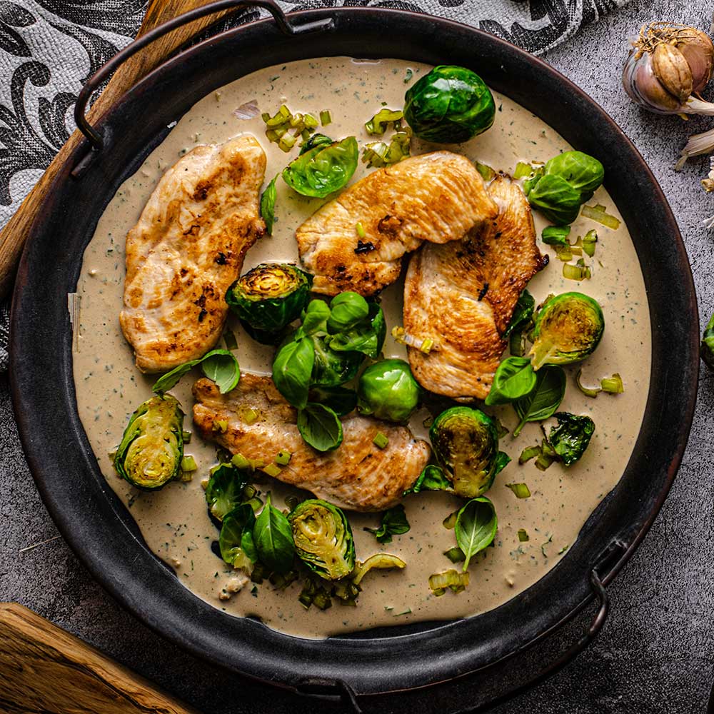 Hähnchenbrustfilets in einer Soße aus Sahne, dazu Rosenkohl