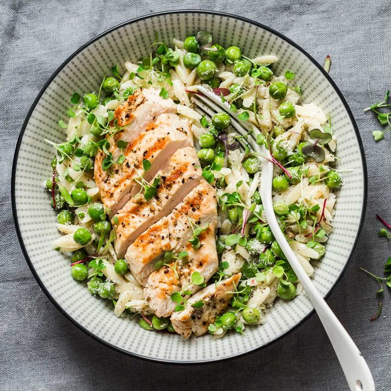 Orzo und Erbsen zu Hähnchenbrust