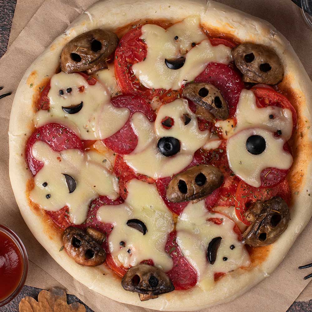 Ofen auf 220 °C Umluft vorheizen. Tomaten waschen und in Scheiben schneiden. Champignons putzen, halbieren und kleine Löcher als Augen aushöhlen. Aus den Mozzarellascheiben kleine Gespenster schneiden. Oliven in kleine Scheiben und Stifte schneiden. Pizzaböden auf mit Backpapier belegte Bleche legen, mit Tomatensoße bestreichen und mit Tomaten, Salami, Pilzen und Käsegespenster belegen. Olivenstücke als Gespenstermünder und -augen auf den Käse legen. Auf mittlerer Schiene für 10 Minuten backen.