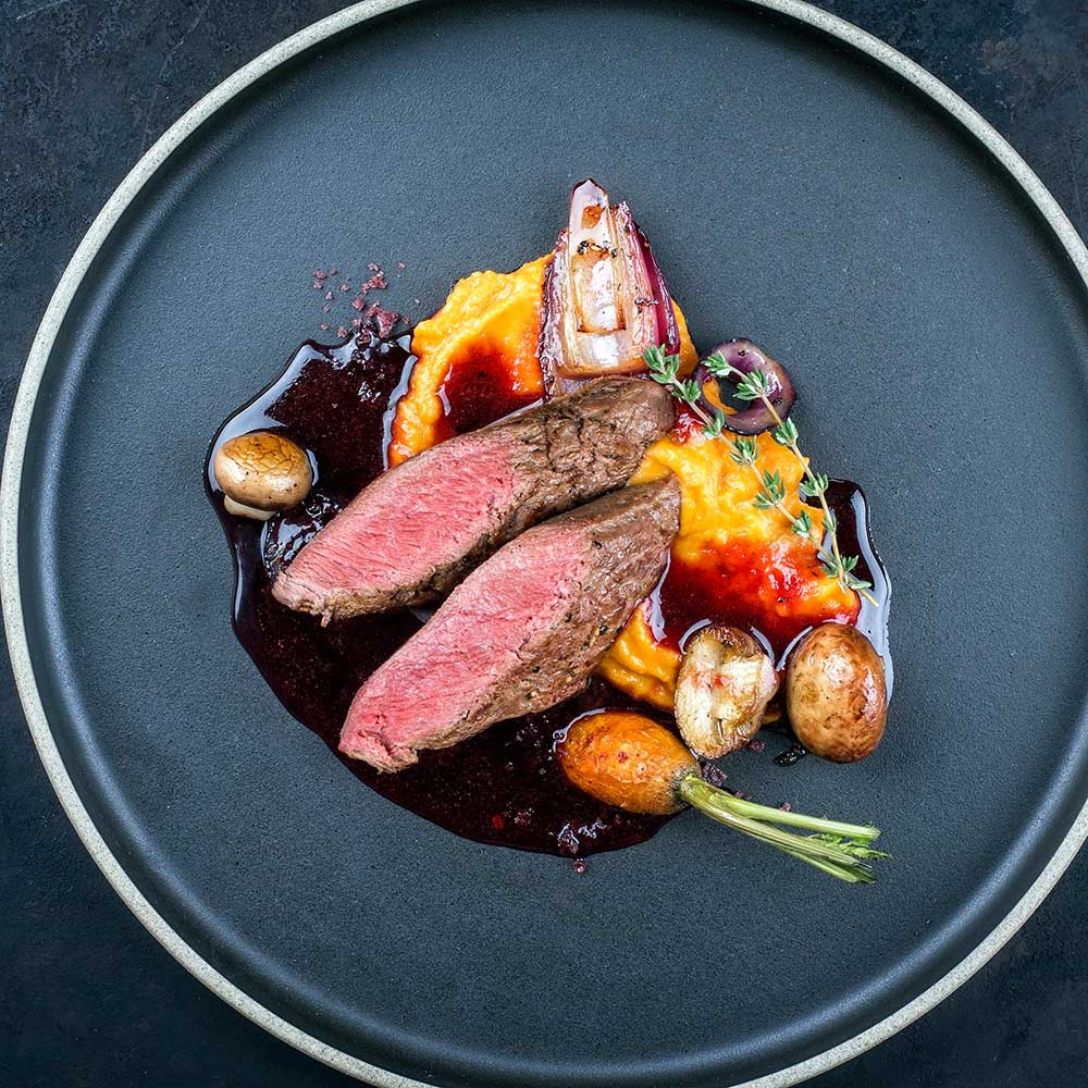 Püree mittig auf den Tellern anrichten. Filet in dünne Scheiben schneiden und zusammen mit den Champignons auf dem Püree platzieren. Waldbeeren-Rotweinjus großzügig über das Fleisch geben und etwas daneben auf den Teller träufeln. Optional mit frischen Kräutern oder ganzen Waldbeeren garnieren.