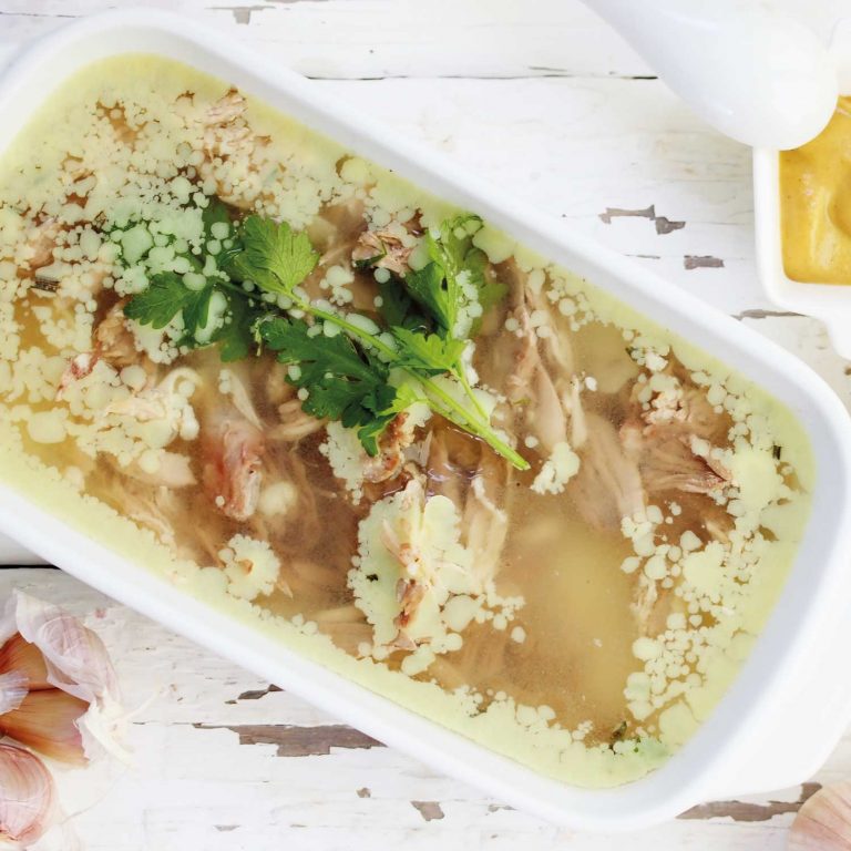 Die Sülze schmeckt in Scheiben geschnitten mit Senf oder Kräuterremoulade und knusprigen Bratkartoffeln.