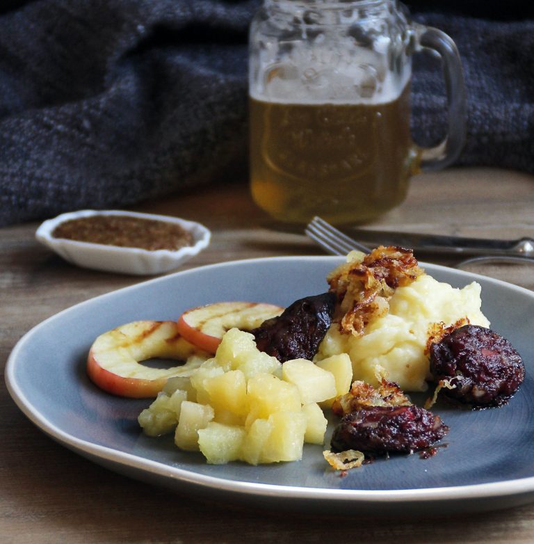 Blutwurst mit Kartoffelpüree, Äpfeln und Speck – herrlich deftig!
