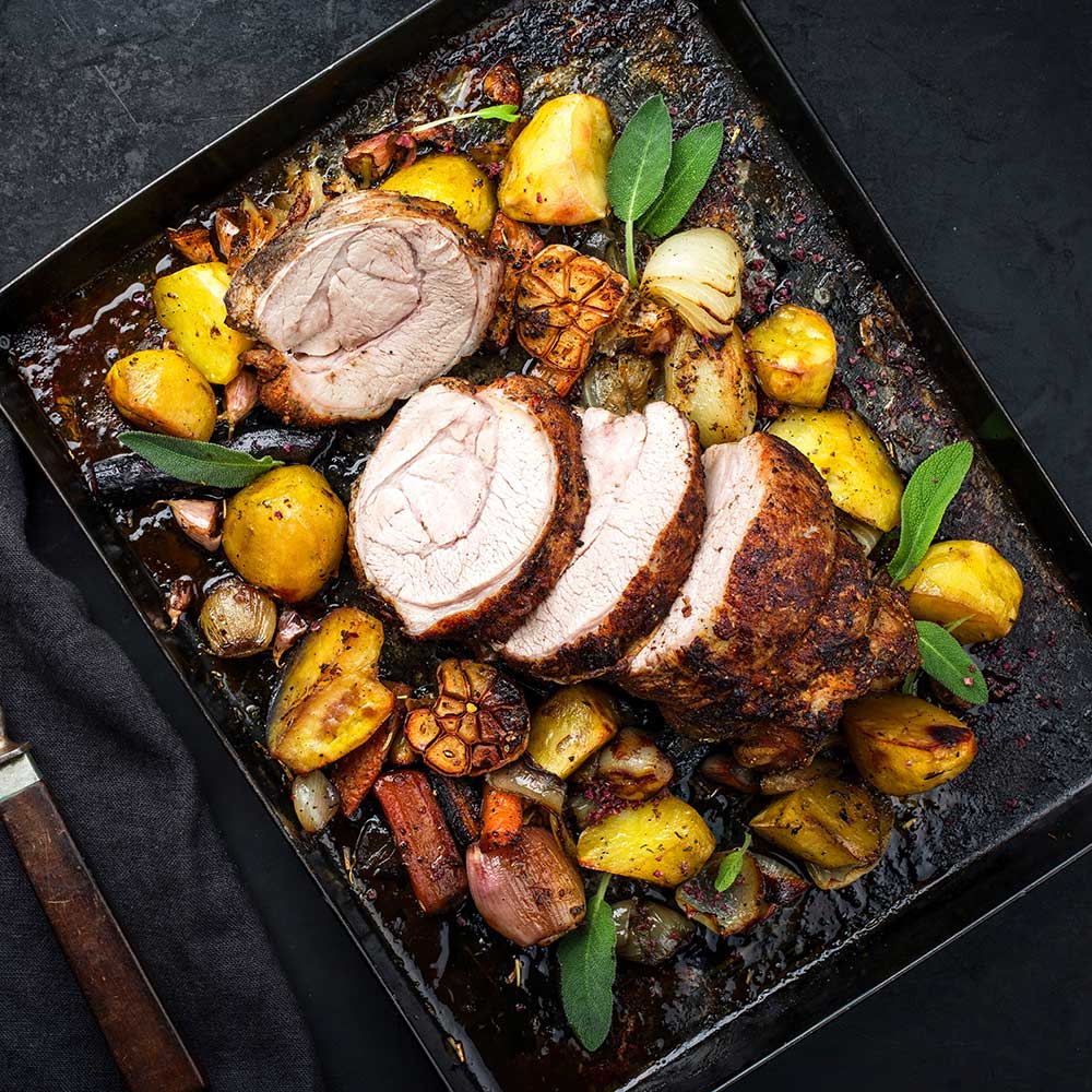 Im vorgeheizten Ofen etwa 1 1/2 bis 2 Stunden garen. Zwischendurch mit dem Bratensaft begießen. Nach Belieben die Temperatur in den letzten 10–15 Minuten auf 200 °C erhöhen, um dem Braten und Gemüse eine knusprige Oberfläche zu verleihen. Braten aus dem Ofen nehmen und vor dem Anschneiden etwa 10 Minuten ruhen lassen. Zehen aus den halbierten Knoblauchknollen drücken, mit einer Gabel zerdrücken und dazureichen.