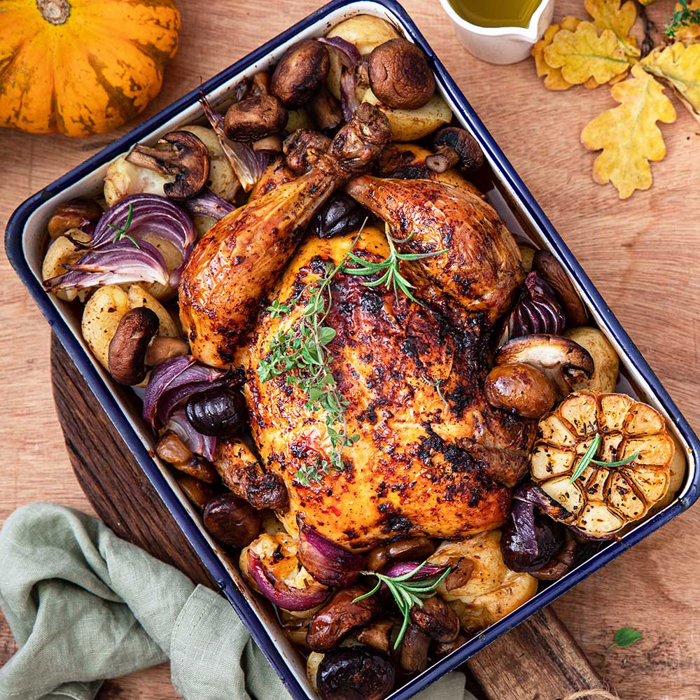 Die Haut des Hähnchens mit 2 EL Olivenöl einreiben und mit Salz, Pfeffer, Paprikapulver und getrocknetem Thymian würzen. Kartoffeln halbieren oder vierteln. Pilze je nach Größe halbieren oder ganz lassen. Zwiebeln abziehen und in Spalten schneiden, Knoblauchknolle halbieren. Gemüse mit 2 EL Olivenöl, Salz und Pfeffer vermengen. Restlichen Rosmarin und Thymian dazugeben und alles in eine große, ofenfeste Form geben.