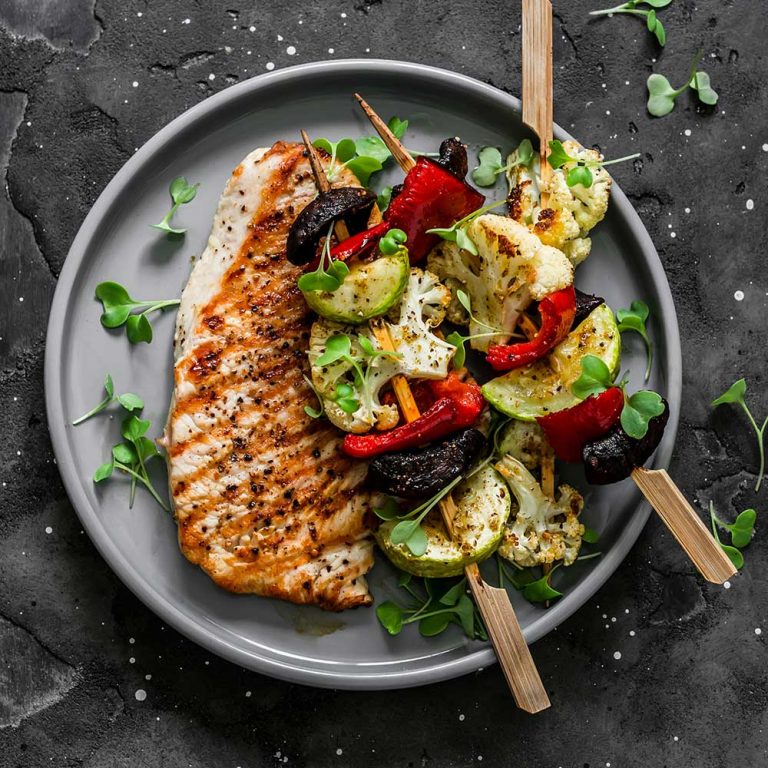 Aufgespießtes Gemüse passt perfekt zu Schweinekoteletts
