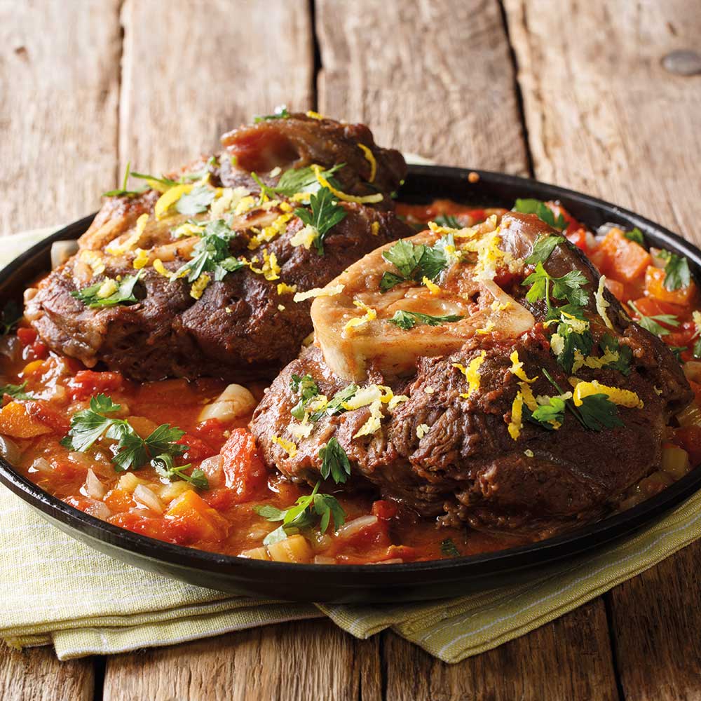 Bräter aus dem Ofen nehmen und das Fleisch auf Teller füllen. Gremolata darübergeben. Wer mag, gibt noch etwas Petersilie als Garnierung über das Gericht. Dazu schmeckt frisches Ciabatta.