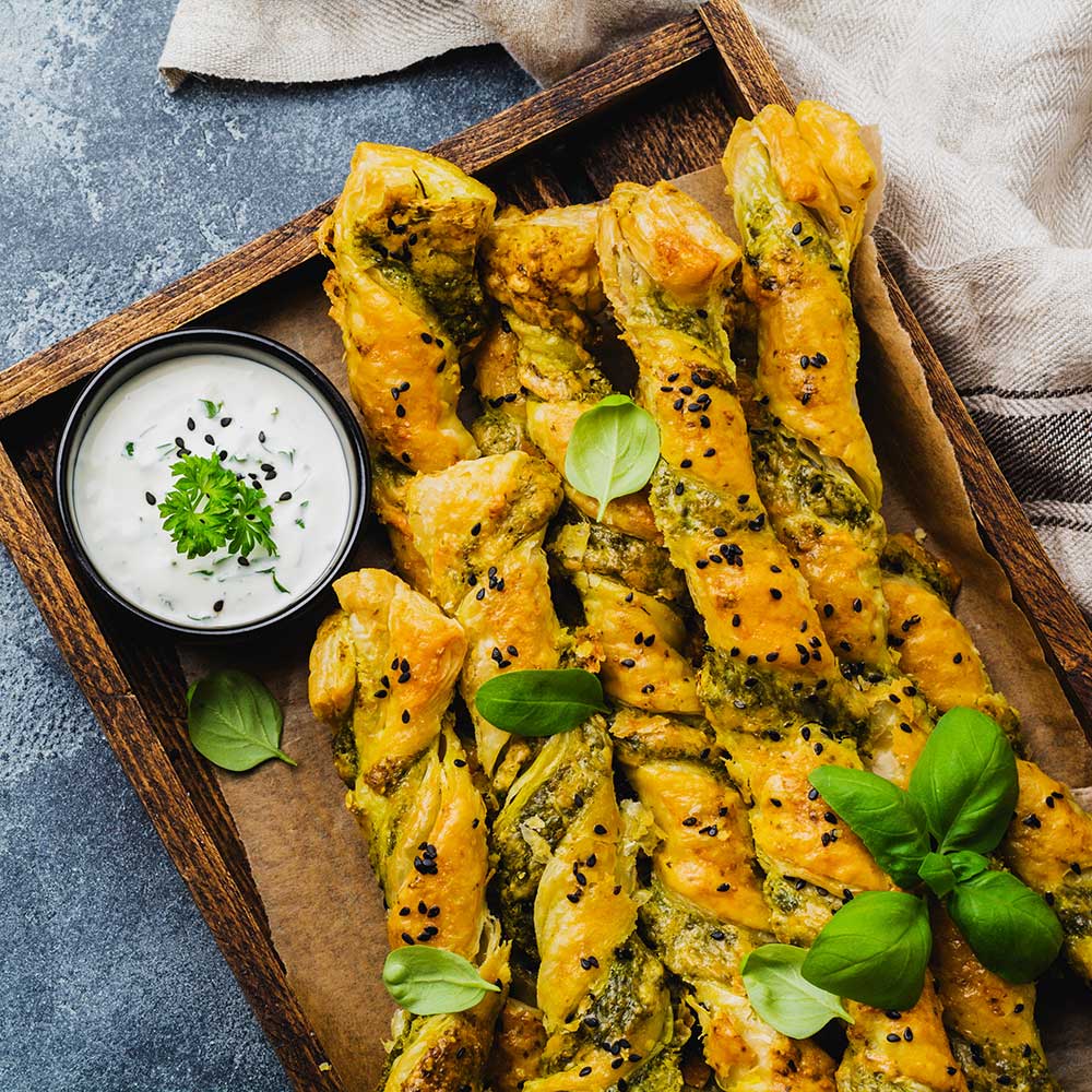 Backofen auf 200 °C vorheizen. Blätterteig auf einer leicht bemehlten Arbeitsfläche ausrollen und mit Basilikumpesto bestreichen. Längs in etwa 1,5 cm breite Streifen schneiden. Jeden Streifen an den Enden fassen und vorsichtig zu einer Spirale verdrehen, dann auf ein mit Backpapier belegtes Backblech legen.