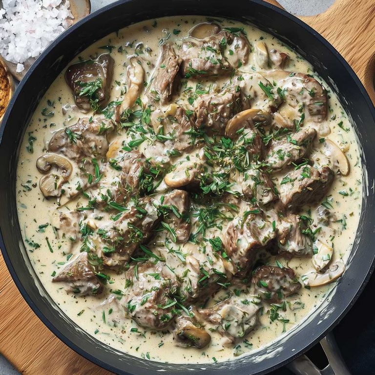 In der gleichen Pfanne die Zwiebeln anbraten. Champignons dazugeben und für 4 Minuten anbraten. Fleisch zu den Pilzen geben. Mit Salz, Pfeffer, Rinderfond und Senf würzen. Sahne und 250 ml Wasser dazugeben und alles für weitere 40 Minuten bei niedriger Temperatur und geschlossenem Deckel garen lassen. 5 Minuten vor Ende der Kochzeit den Estragon dazugeben. Dazu passen Spätzle oder Nudeln.