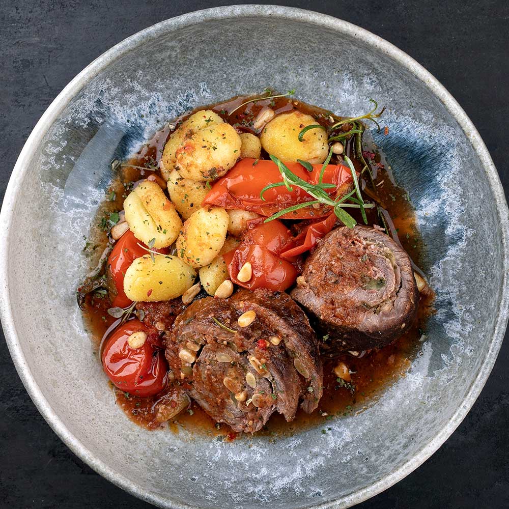 Gnocchi in einer Pfanne mit Öl goldbraun anbraten (ca. 3–4 Minuten). Knoblauch dazupressen, Kirschtomaten zugeben und alles sautieren, bis die Tomaten weich werden. Mit Salz und Pfeffer abschmecken und zusammen mit den Rouladen portionsweise auf Tellern anrichten. Nach Belieben zum Servieren einige Pinienkerne fettfrei anrösten und darüberstreuen.