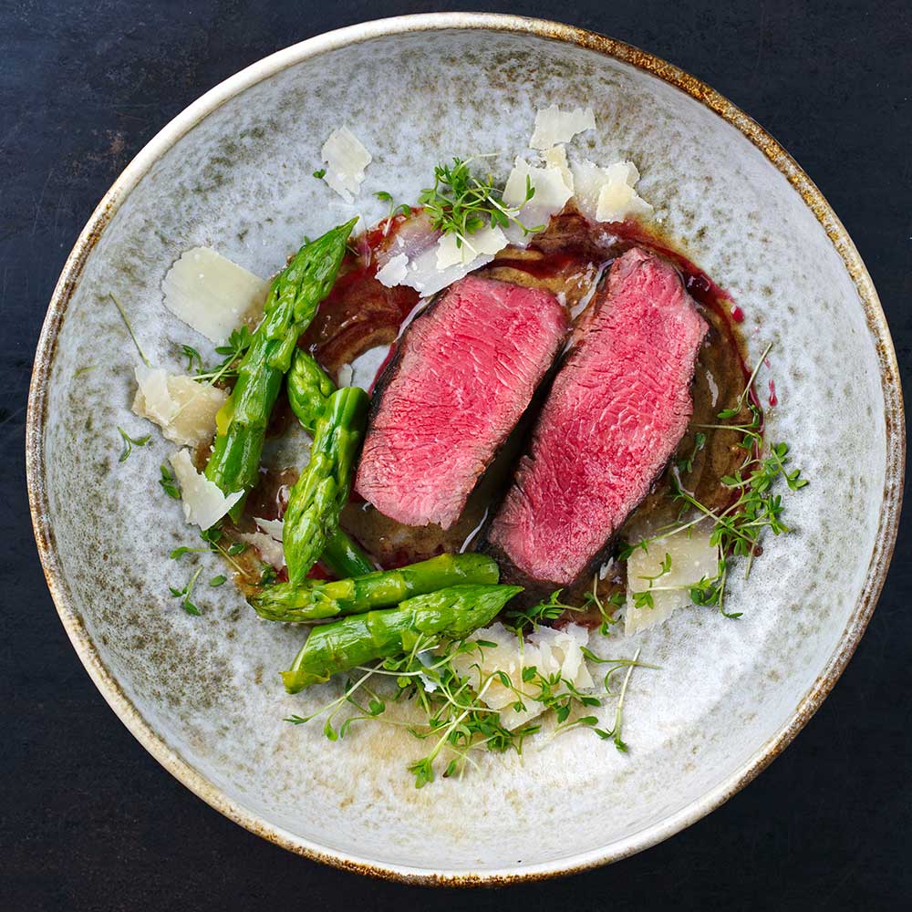 Schalotte abziehen, fein würfeln und in der Steakpfanne glasig dünsten. Tomatenmark einrühren und kurz anschwitzen. Mit Rotwein ablöschen und auf die Hälfte reduzieren lassen. Rinderfond hinzufügen und weitere 5 Minuten köcheln lassen. Mit Butter und Honig verfeinern und mit Salz und Pfeffer abschmecken. Soße auf Teller geben, Steak aufschneiden und daraufsetzen. Mit grünem Spargel und gehobeltem Parmesan anrichten. Nach Belieben etwas Kresse darüberstreuen.