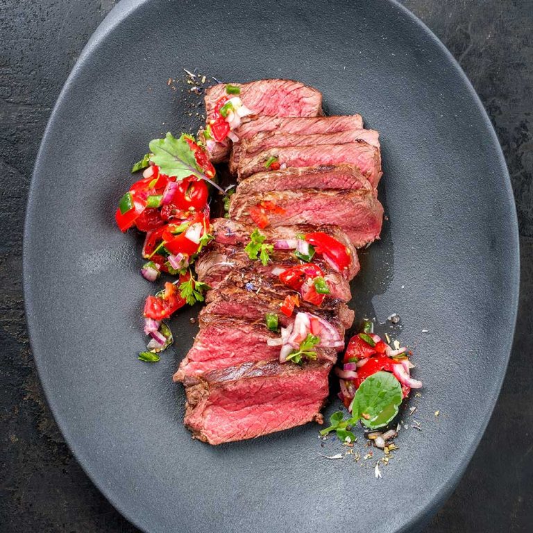 Fleisch locker mit Alufolie abdecken und 5–8 Minuten ruhen lassen, damit sich der Fleischsaft gleichmäßig verteilen kann. Dann das Steak schräg in Scheiben schneiden und die Tomatensalsa darüber oder daneben geben. Dazu passt eine Ofenkartoffel, knuspriges Brot oder ein grüner Salat.