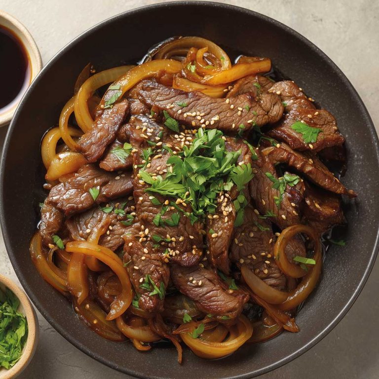 Rindfleisch abtupfen und quer zur Faser in dünne Streifen schneiden. Mit Zucker, je 1 EL Sojasoße und Sonnenblumenöl in eine Schüssel geben und gut vermischen. Zwiebel schälen und in Ringe schneiden. Ingwer schälen und in feine Streifen schneiden.