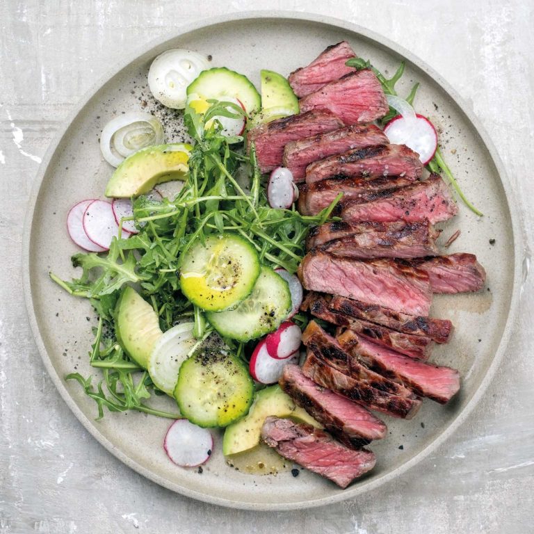Rucola waschen und trocken schütteln. Zwiebel abziehen. Gurke und Radieschen waschen, putzen. Avocado schälen, Kern herauslösen, in Scheiben schneiden. Salatzutaten auf zwei Tellern anrichten. Das Roastbeef in Scheiben schneiden und dazugeben.