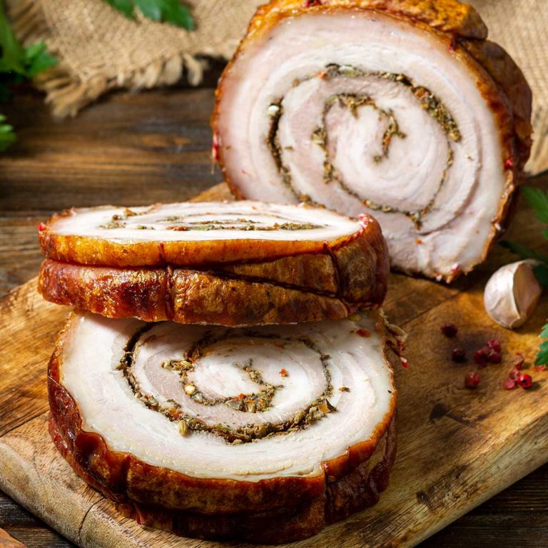 Deckel in den letzten 20 Minuten abnehmen und Temperatur auf 200–220 °C erhöhen, bis es oben schön bräunt. Braten 10–15 Minuten ruhen lassen, dann Garn entfernen und aufschneiden. Bratensaft durch ein Sieb gießen und abschmecken, bei Bedarf mit Soßenbinder andicken.