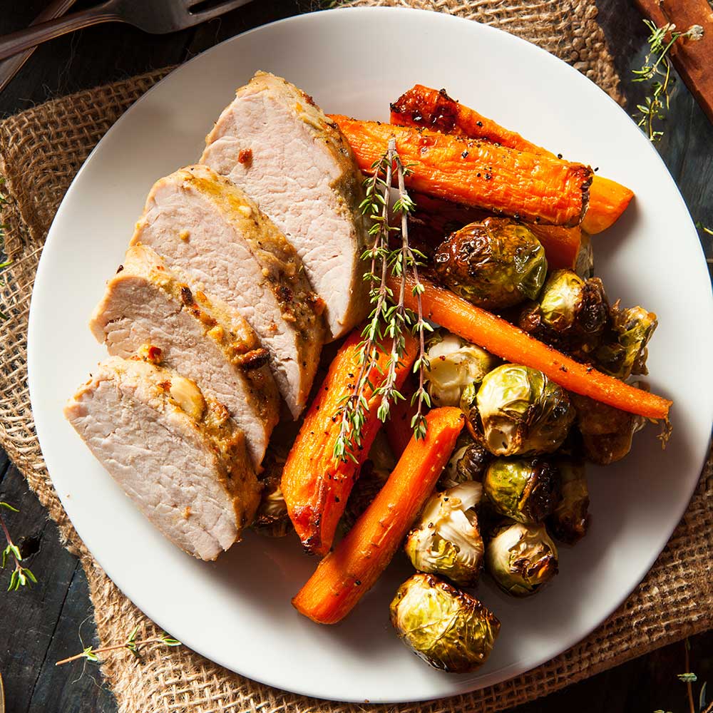Rosenkohl putzen, Strunk kreuzweise einschneiden. In Salzwasser 4–5 Minuten blanchieren, dann kalt abschrecken. In einer Pfanne Öl erhitzen, Rosenkohl darin bei mittlerer Hitze goldbraun braten. Mit Salz, Pfeffer und einem Spritzer Balsamico abschmecken. Filet in Scheiben schneiden, auf Tellern anrichten und mit Möhren und Rosenkohl garnieren. Dazu passt eine leichte Senf-Sahnesoße.