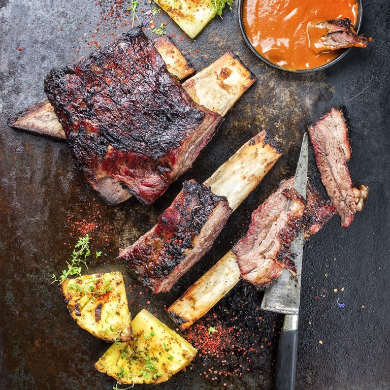 Beef Ribs ca. 3 Stunden im Rauch garen, dabei gelegentlich mit Wasser besprühen. Weitere 3 Stunden indirekt bei 140 °C garen. 15–20 Minuten, bevor sie vom Grill genommen werden, mit der Marinade einpinseln. Fleisch kurz ruhen lassen und am Knochen entlang in Stücke schneiden. Dazu passt: gegrillte Ananas.