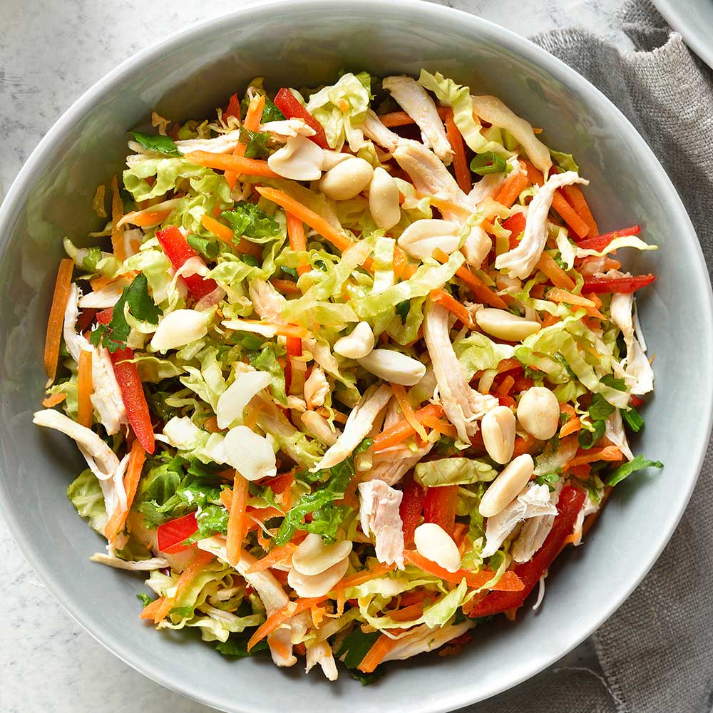Hähnchenstreifen darauf verteilen und mit gehackten Erdnüssen bestreuen. Dazu passen z.B. Bratnudeln oder Baguette.