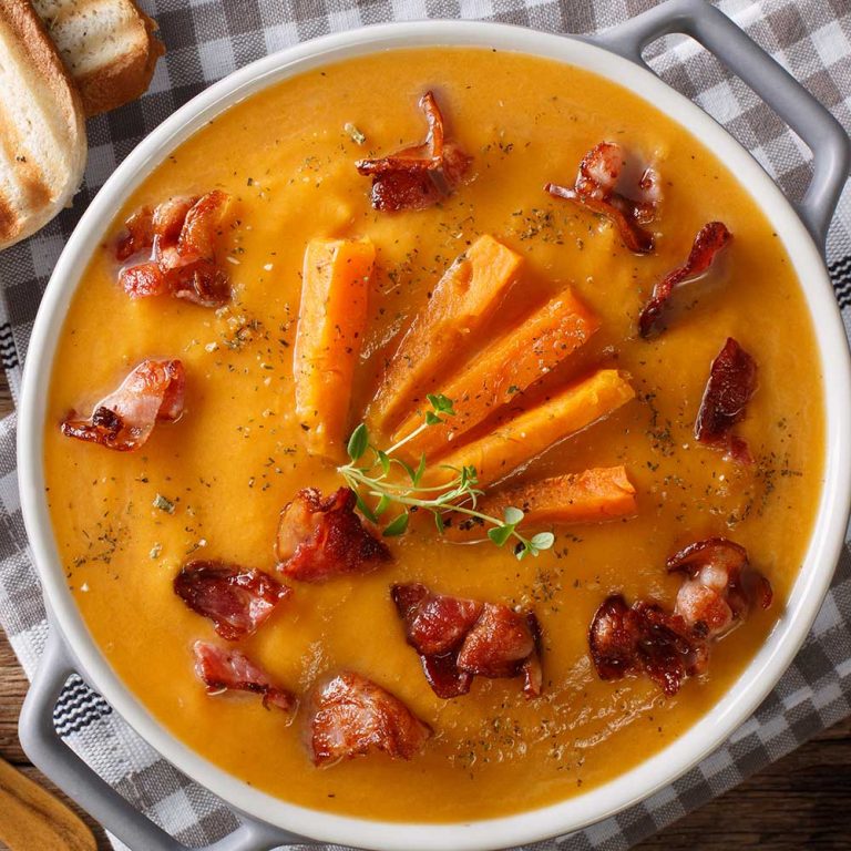Suppe aus Süßkartoffeln, mit Bacon verfeinert