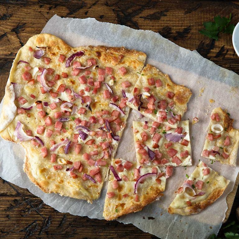 Auf das heiße Blech oder den Stein ziehen und 8–10 Minuten backen, bis der Flammkuchen knusprig ist und die Ränder leicht gebräunt sind. Am besten direkt heiß und knusprig servieren. Dazu passt ein grüner Salat und ein Weißwein.